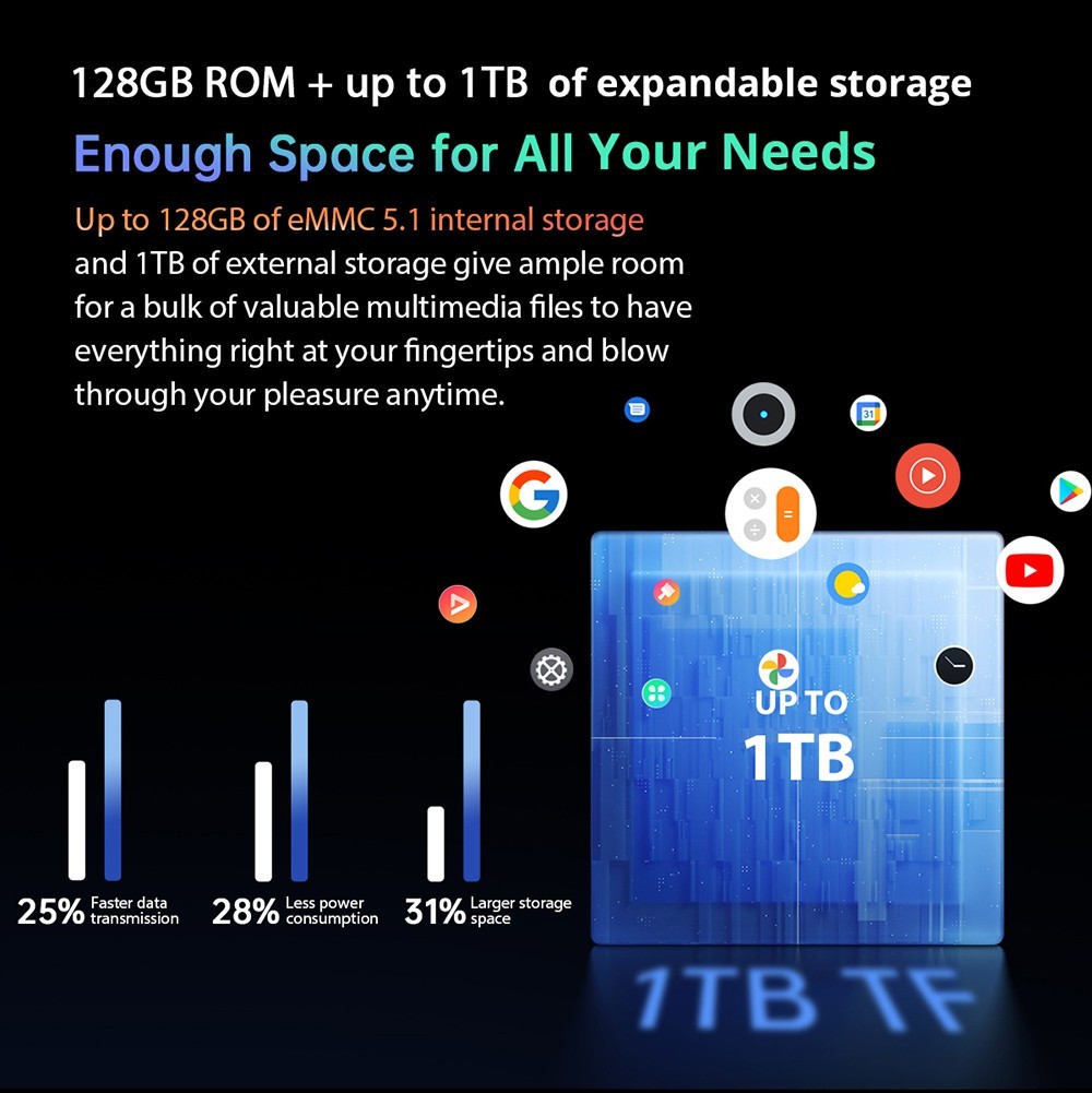 128GB ROM + up to 1TB TF, Dual Slots for SIM/TF Cards