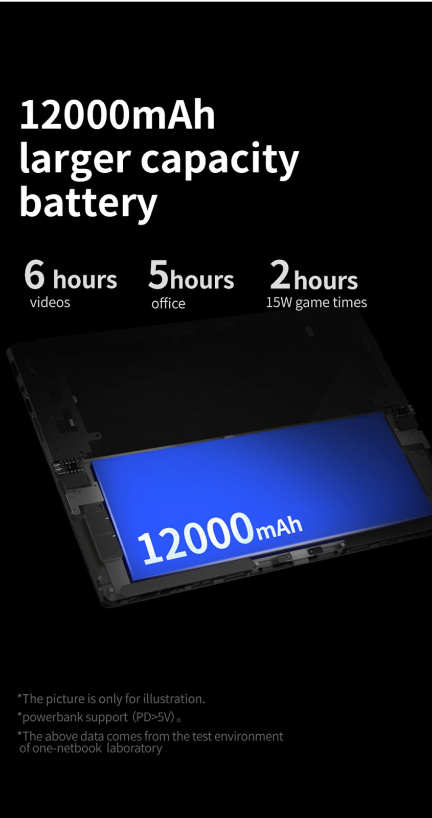 12000mAh high capacity battery, One Netbook T1 sustains a much longer battery life. With a 45W adapter, you can expect a rapid battery recharging cycle as well.
