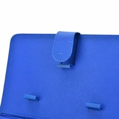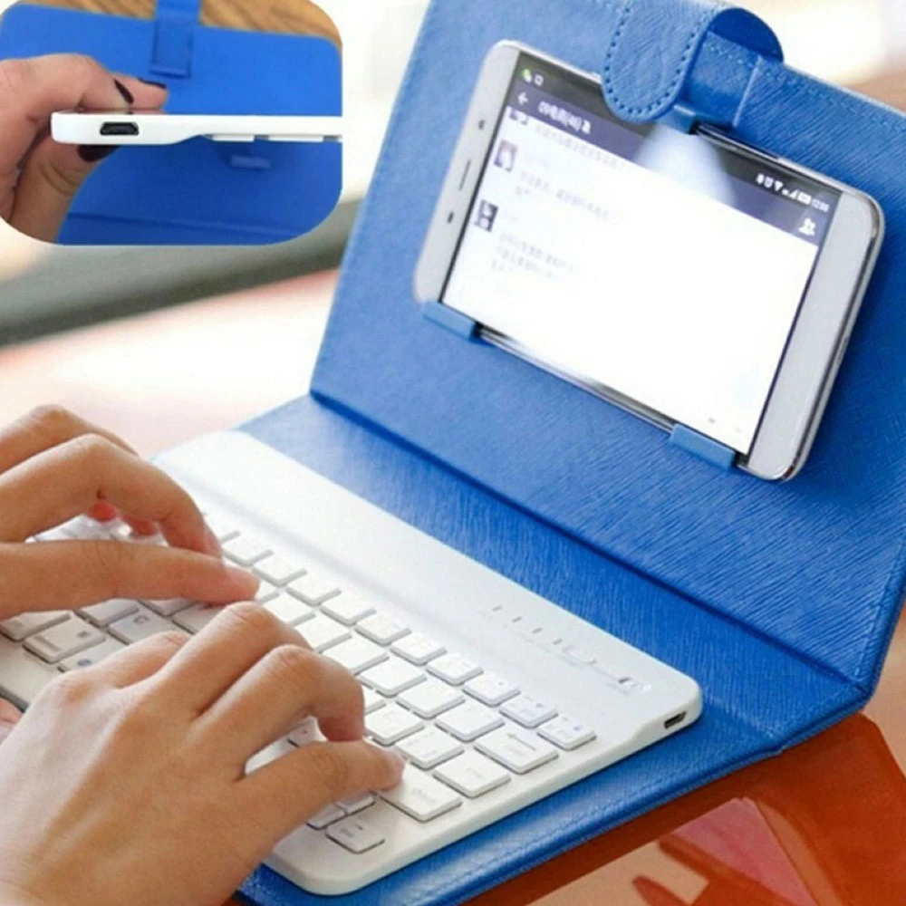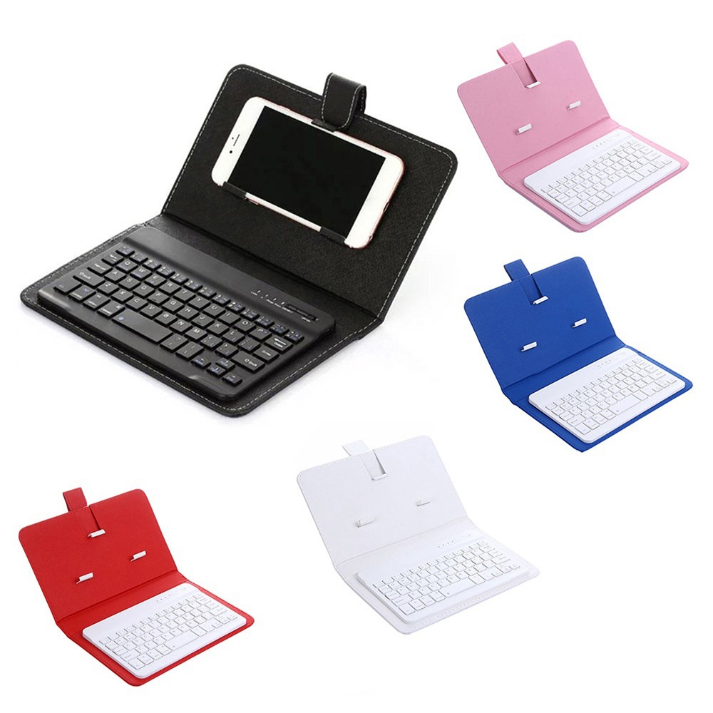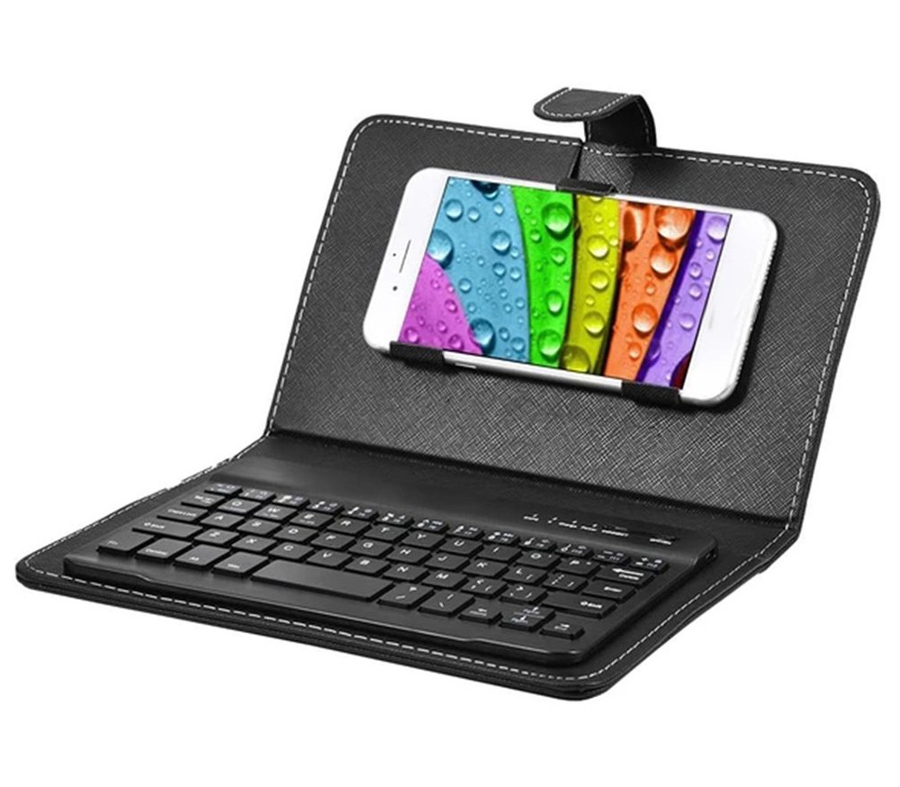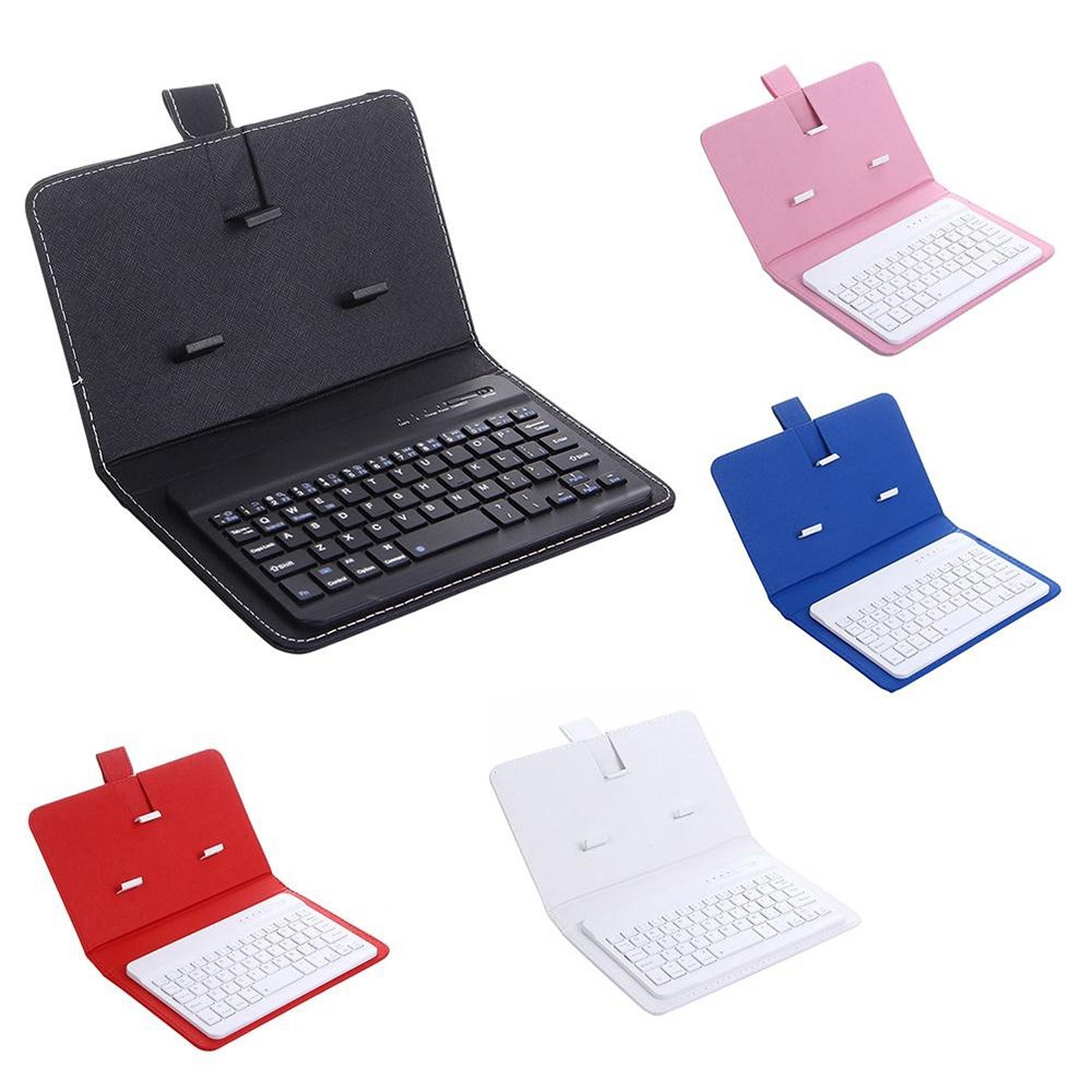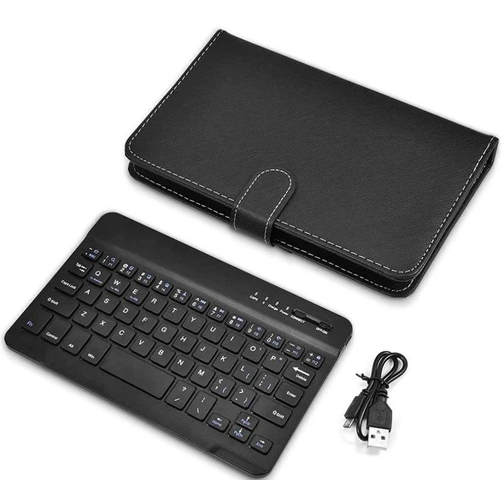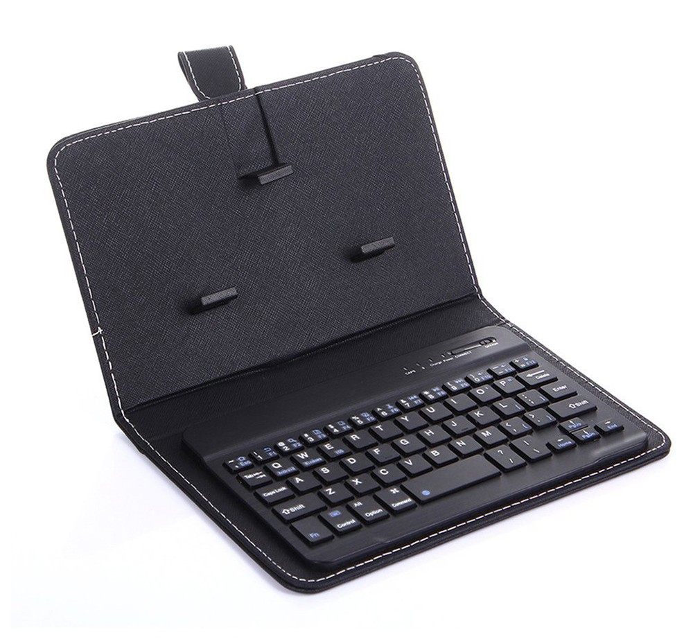 This integrated keyboard with a faux leather case is portable and practical.