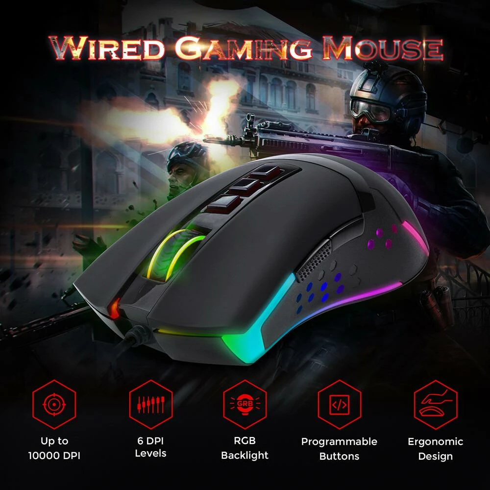 To meet your different needs, the gaming mouse has 6 DPI levels with color indicators, including 500/1000/2000/3000/4000/5000 DPI. Besides, the DPI value can be freely adjusted from 200 to 10000 via software.