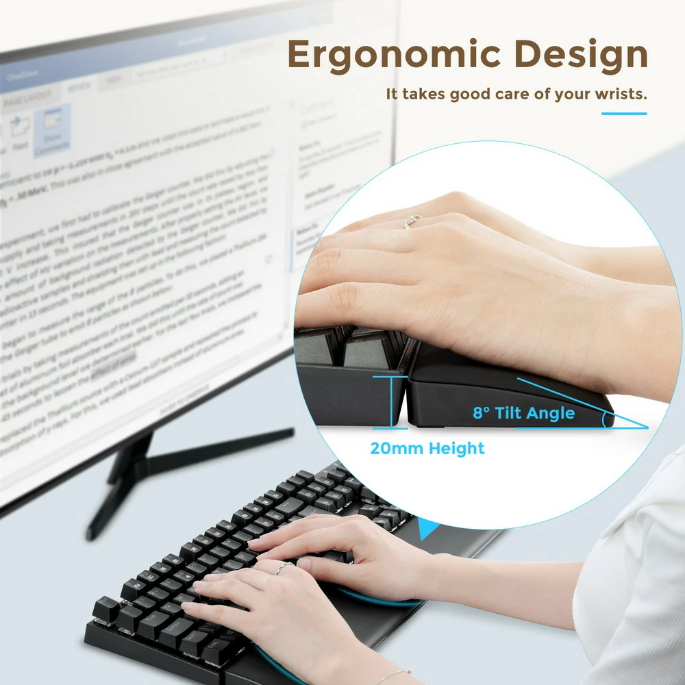 With a 20mm height and an 8° tilt angle, you can place your hands on the keyboard and wrist rest naturally and comfortably without hanging your wrists.